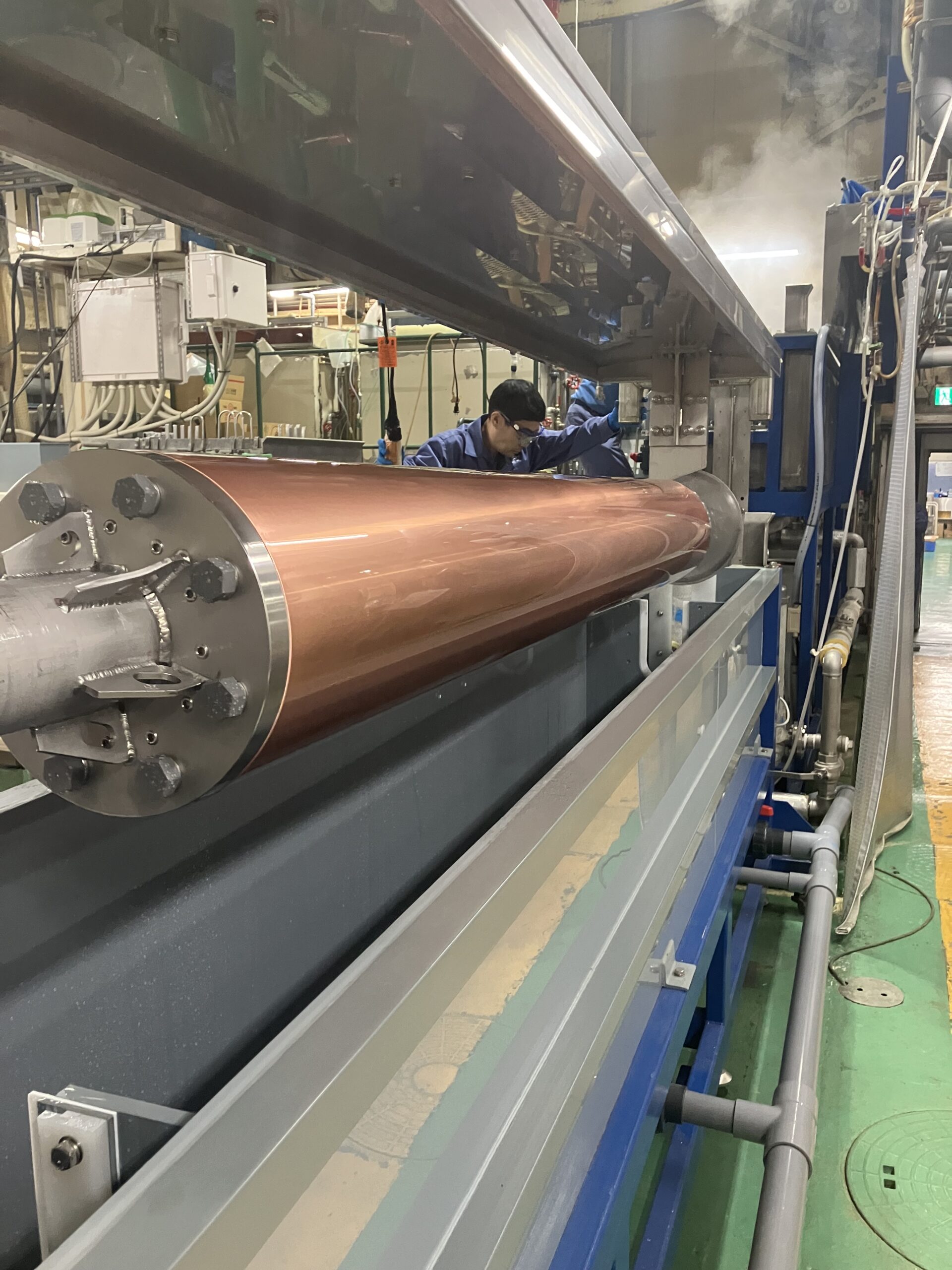 従来の縦型めっき槽では処理が出来なかったサイズの製品ですが、最大面長2600mm、φ320のロール製品をめっきすることが可能な横型のめっき槽を新設いたしました。